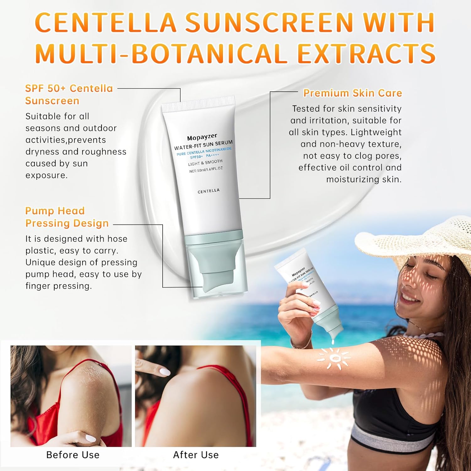 - Moisturizing SPF 50 Sunscreen: The sunscreen for face enrich with pure centella, niacinamide and plants extracts. Mild formulation of sunscreen derived from nature's extract, nourish and calm the skin, provides moisturizing and soothing